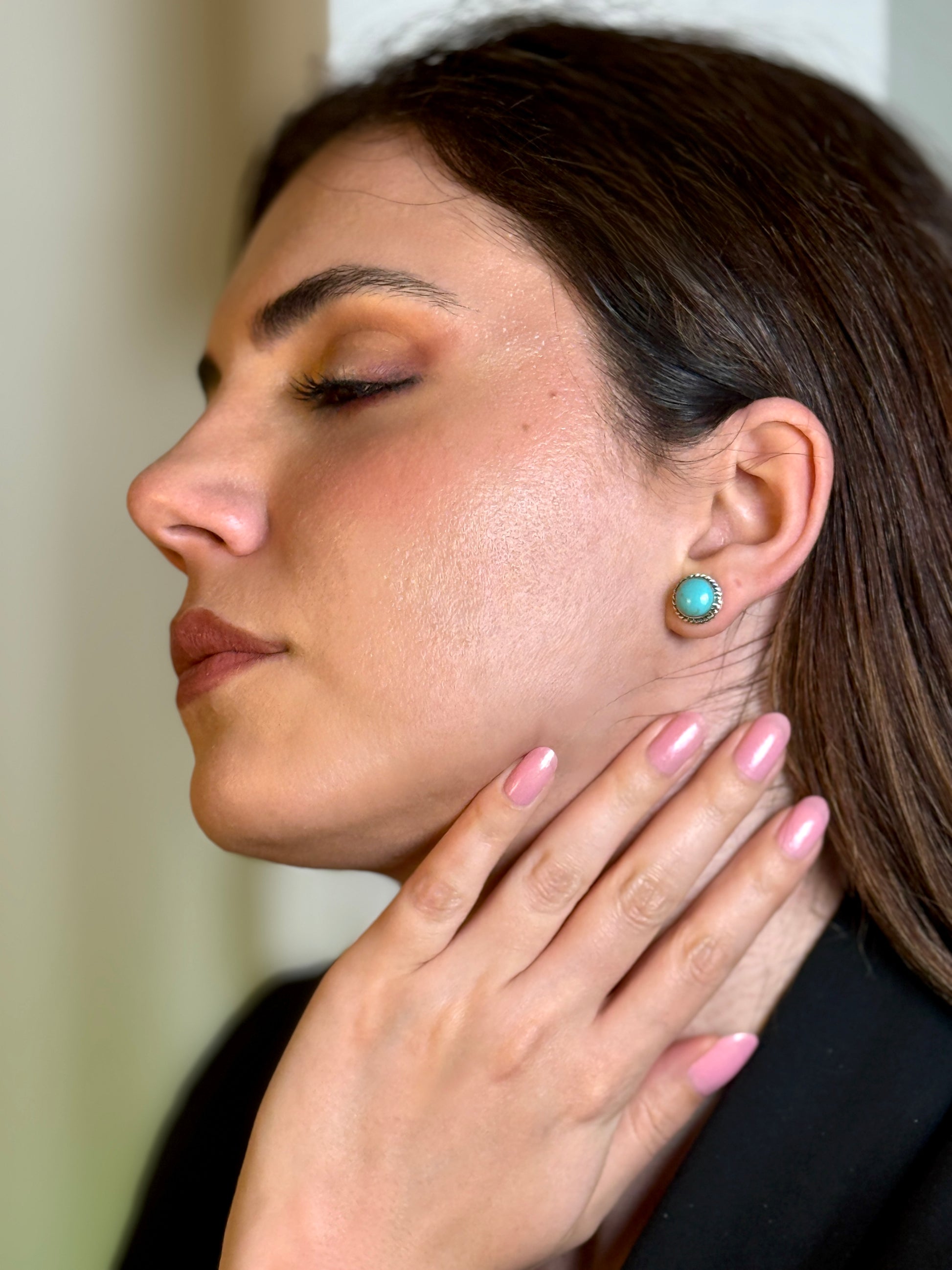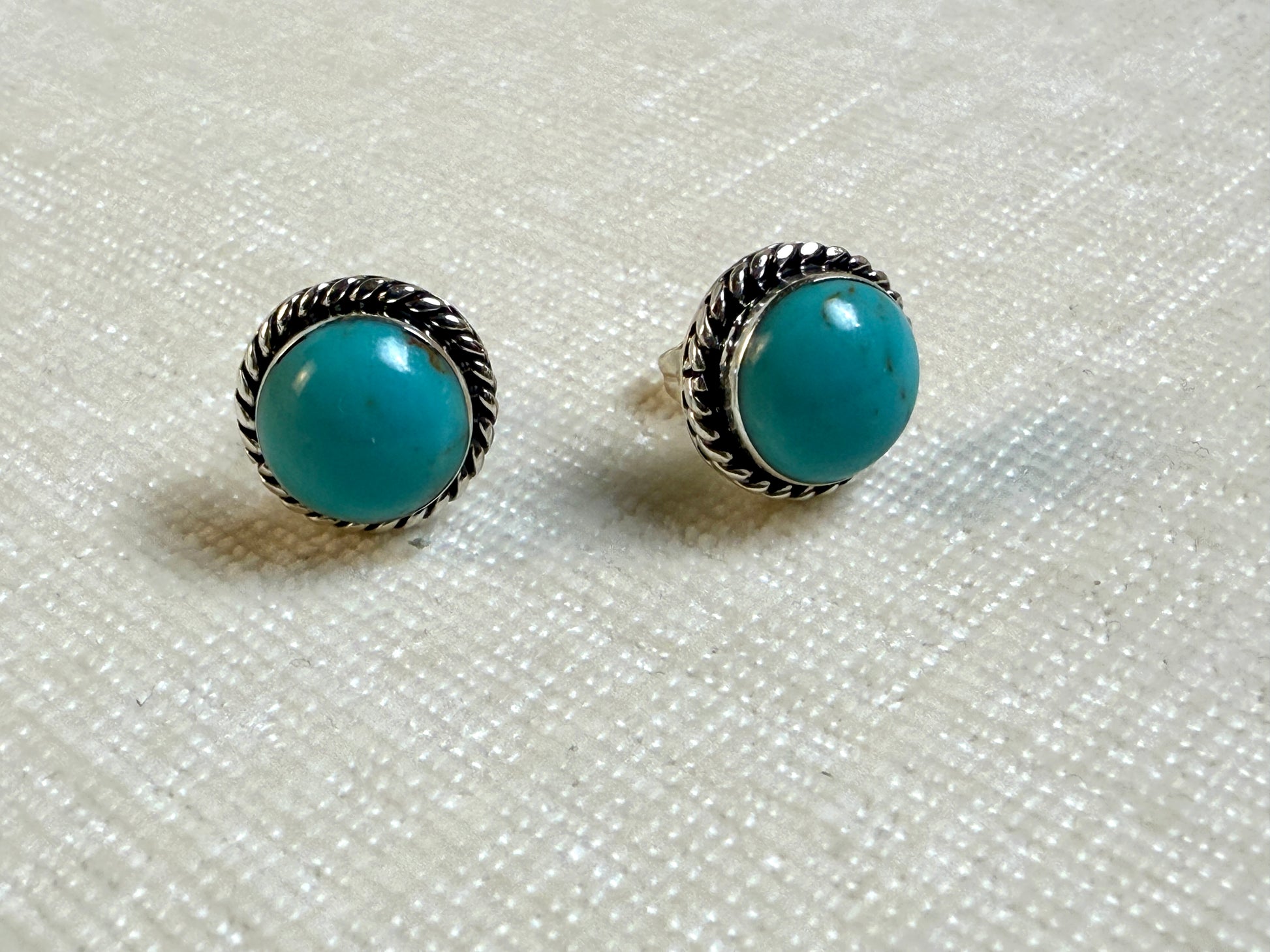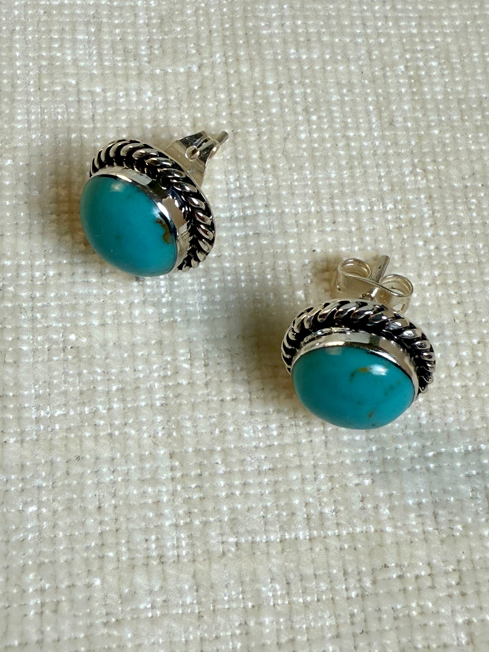 Bold and beautiful! These handcrafted 925 sterling silver stud earrings feature natural turquoise stones in a classic rope bezel setting. A timeless piece for every jewelry lover. ๐